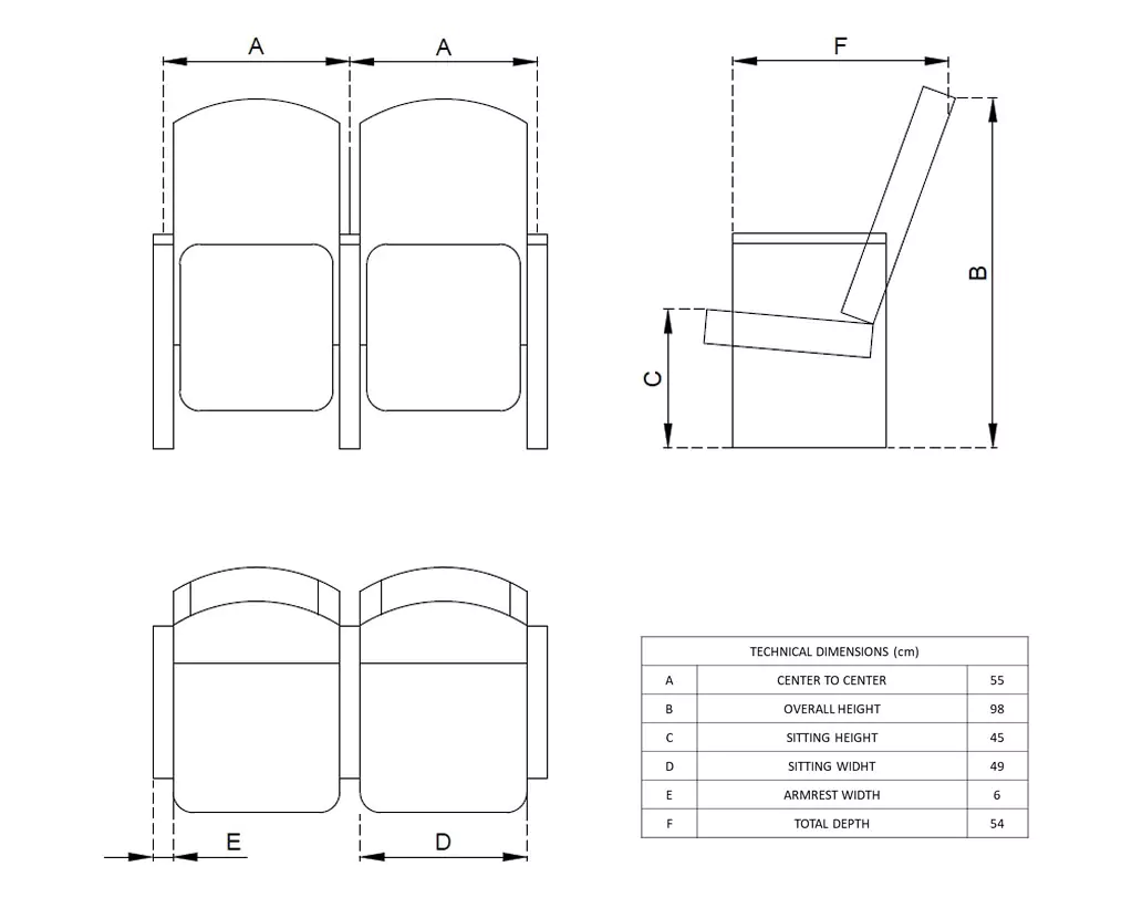 With wooden armrests and an anti-panic writing tablet, this chair is perfect for conferences that require practicality and comfort. The sleek design complements any auditorium or conference space.