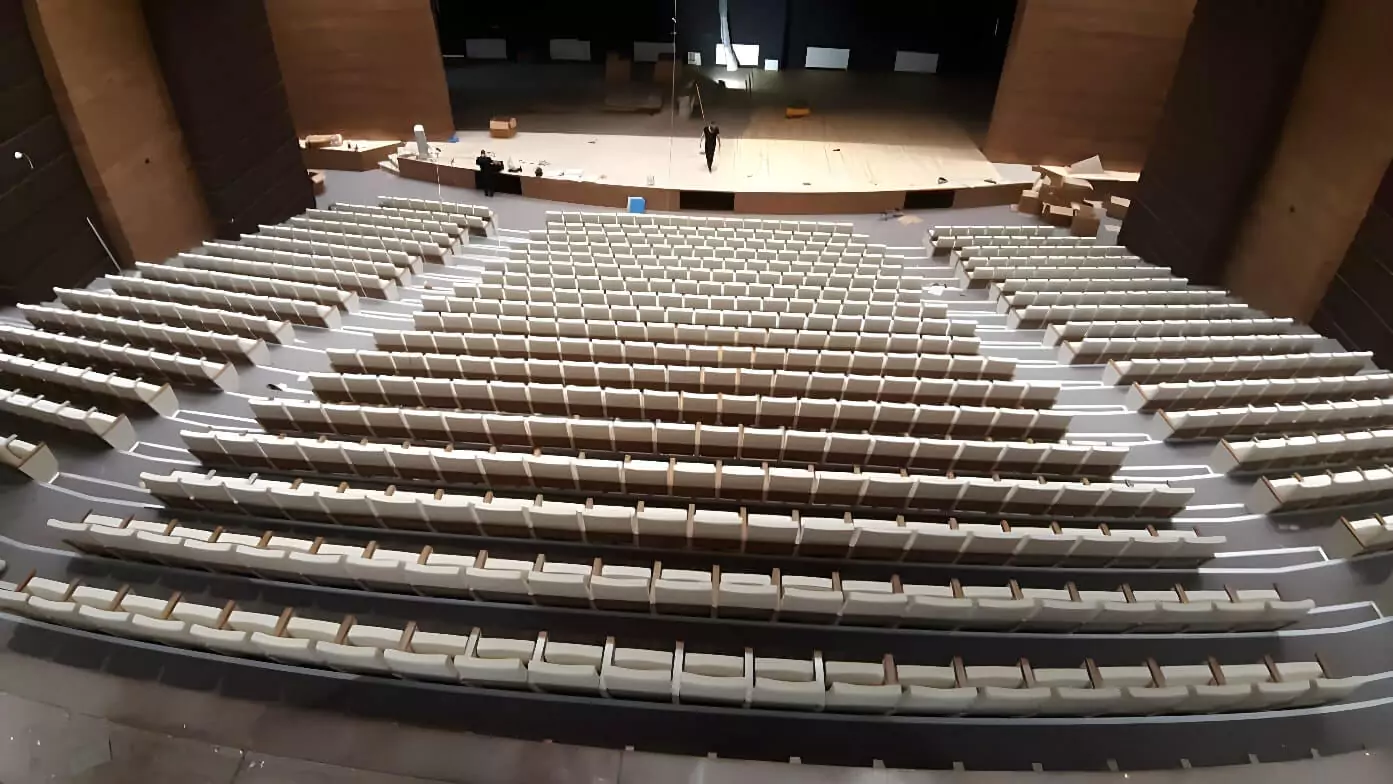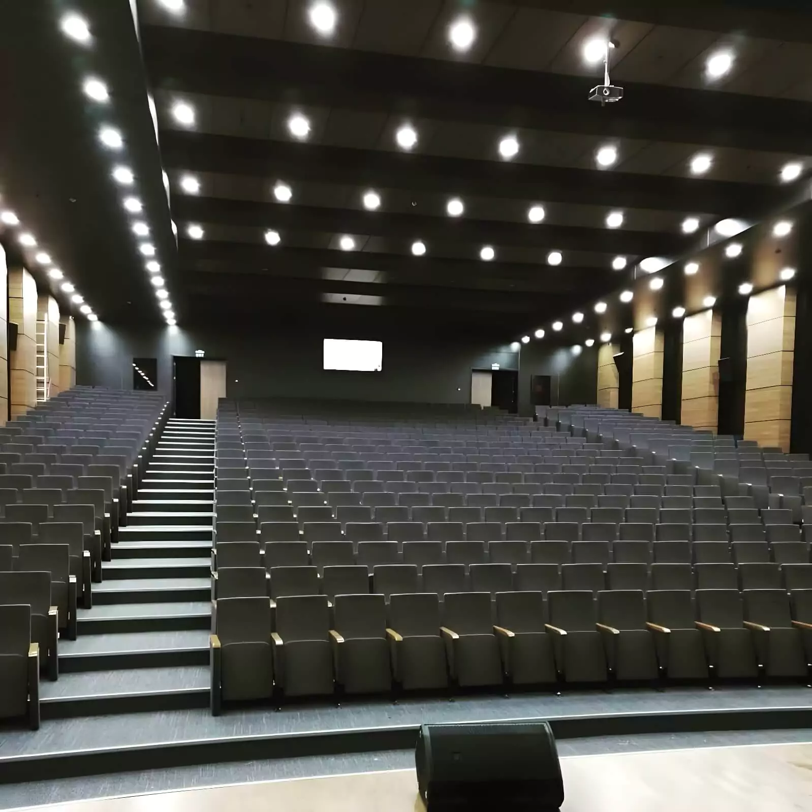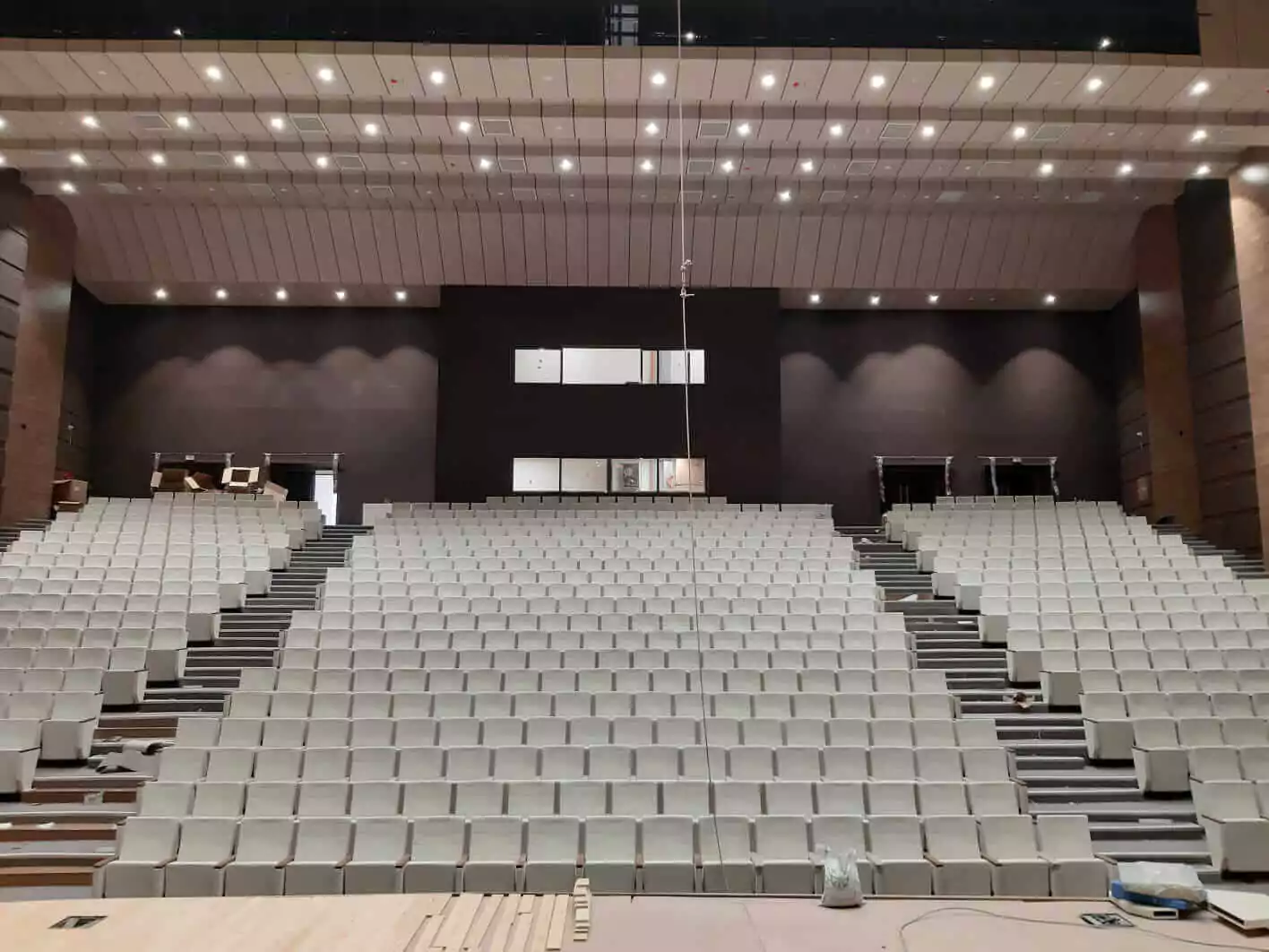 Auditorium seating project featuring durable, European-standard chairs for large gatherings.